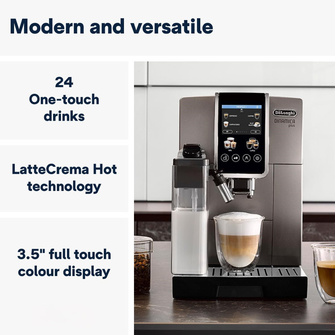 Feature Details Brand De’Longhi Model Dinamica Plus Model Number / SKU ECAM380.95.TBS Machine Type Fully Automatic Bean-to-Cup Coffee Machine Pump Pressure 19 bar Coffee System Bean & Ground Coffee Grinder Built-in Conical Burr Grinder Milk System LatteCrema Automatic Milk System Display Full-Touch Color Display Beverage Types Espresso, Coffee, Cappuccino, Latte & More Customization Adjustable Strength, Temperature & Cup Size User Profiles Yes Water Tank Capacity 1.8 L Bean Hopper Capacity 300 g Color Titanium / Black Design Origin Italy Use Home & Domestic Use