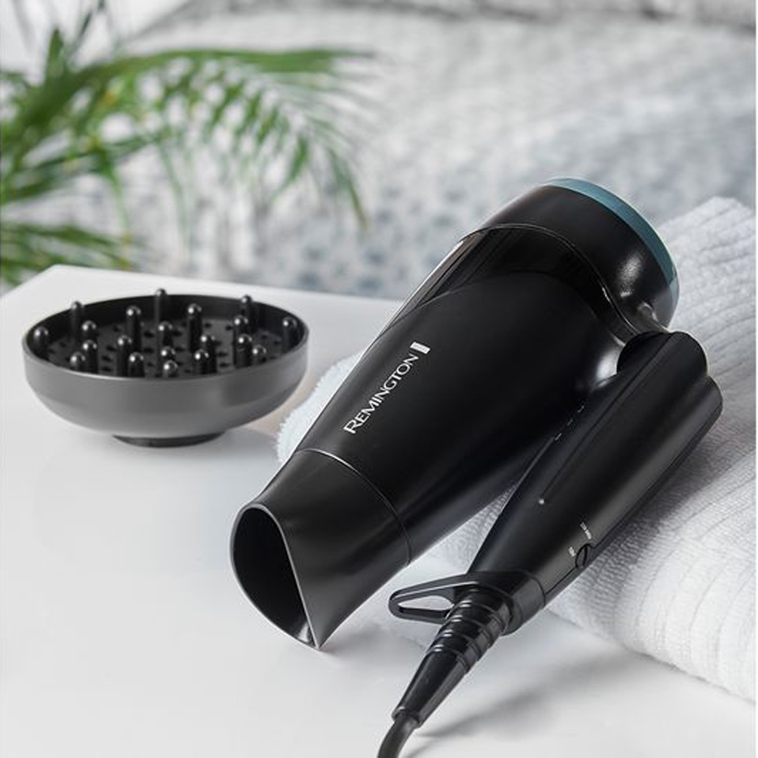Take your styling game on the road with the Remington D1500 On-The-Go Compact Hair Dryer. Despite its travel-friendly size, it delivers 2000 W of drying power. The foldable handle saves space in your luggage or bathroom, while the compact diffuser and concentrator nozzle let you switch between soft volume and smooth finishes. Designed with worldwide dual voltage and a removable rear grill, it’s built to perform wherever you go.