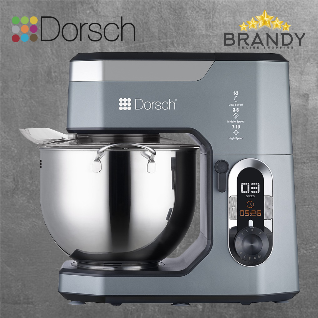 Introducing the Dorsch Stand Mixer 10L DH-07110, an essential kitchen appliance with a powerful 1200W motor that effortlessly handles any mixing task. The 10L stainless steel bowl is perfect for large batches, while 10 speeds plus pulse offer precise control. Included are dough hook, beater, and whisk attachments for versatile recipes. The splash guard ensures a clean workspace. Its sleek black and silver design complements any kitchen.